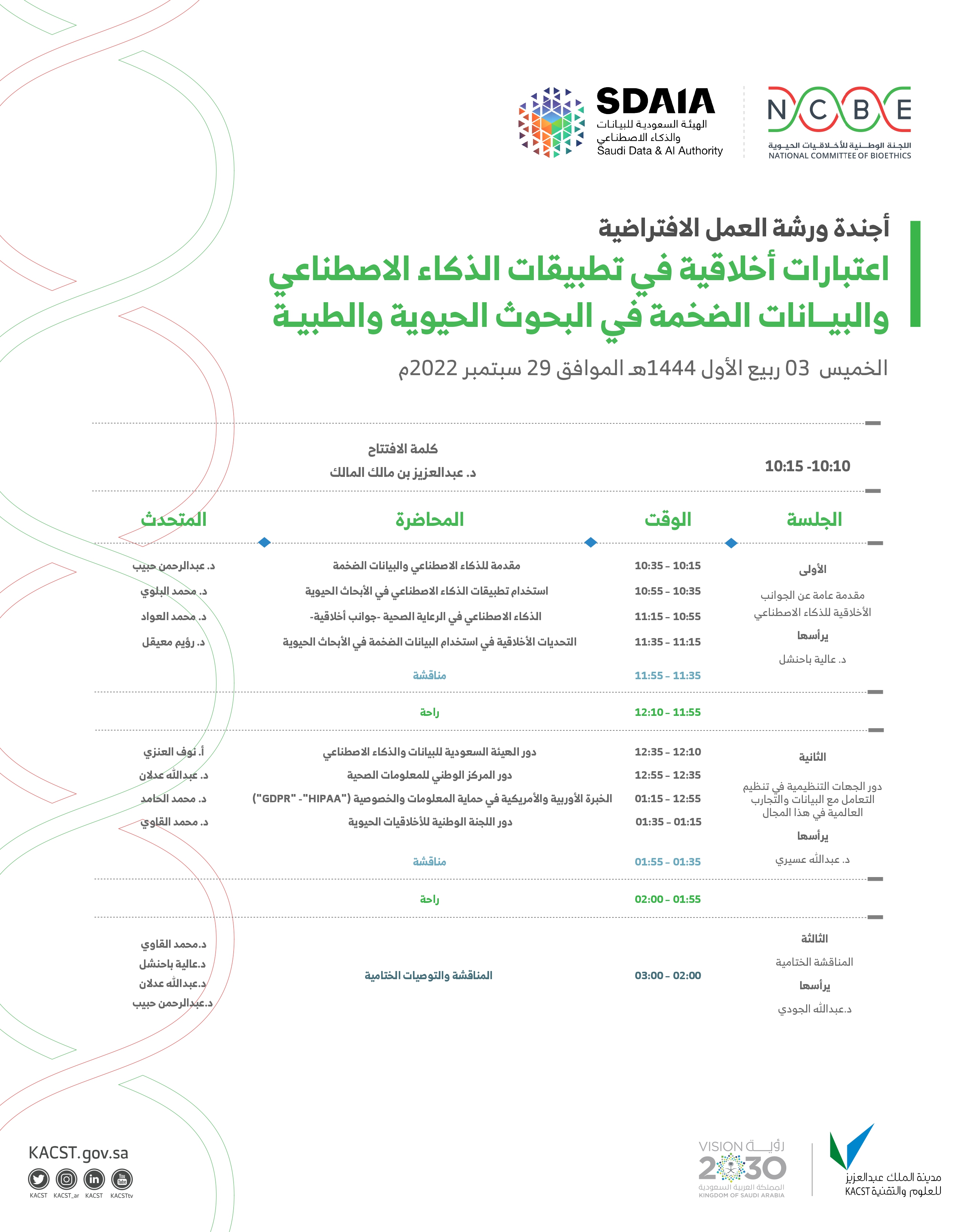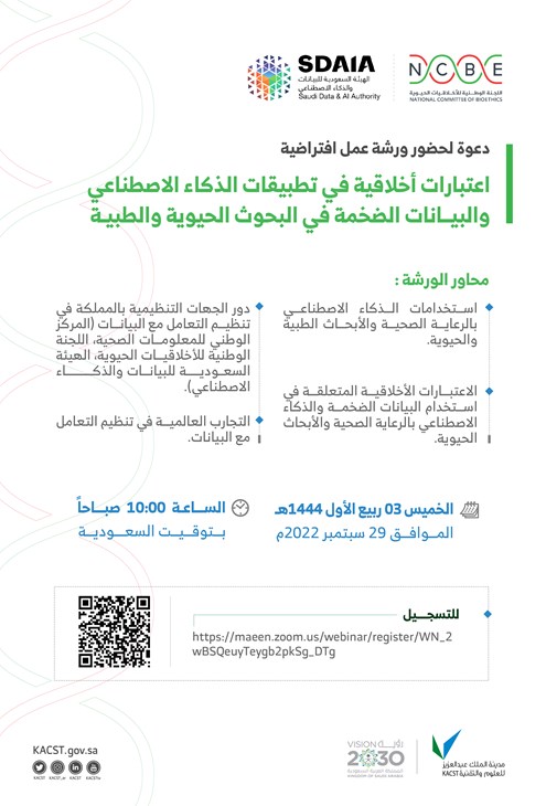 دعوة لحضور ورشة عمل "اعتبارات أخلاقية في تطبيقات الذكاء الاصطناعي والبيانات الضخمة في البحوث الحيوية والطبية"