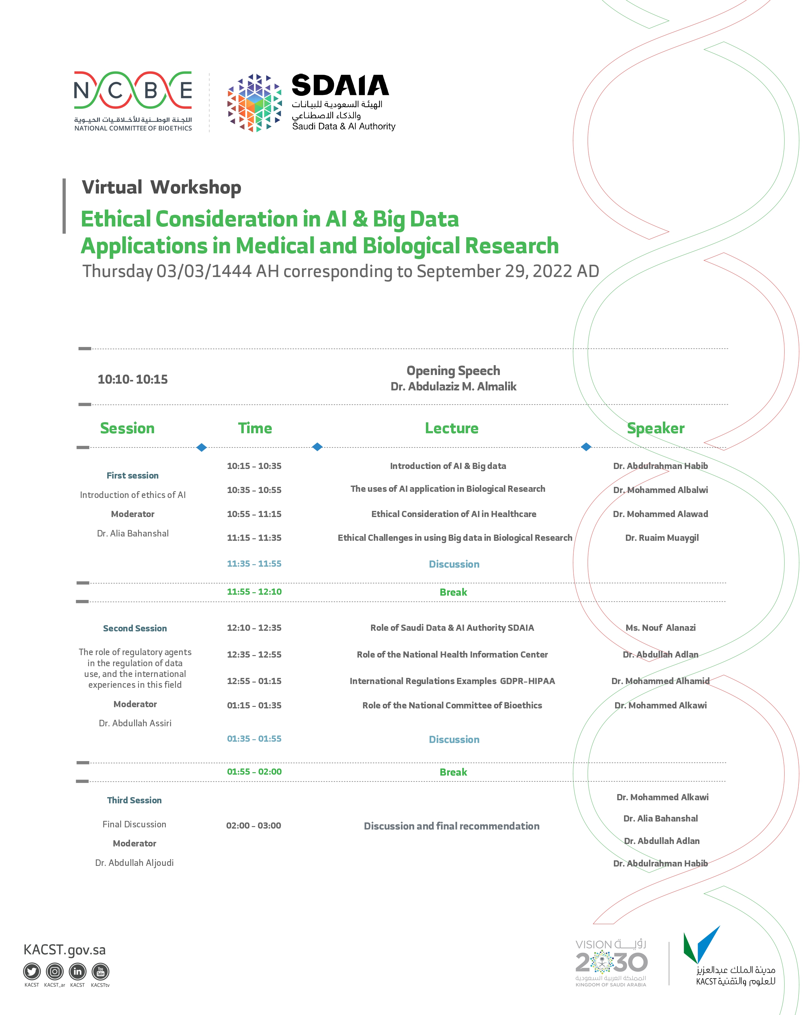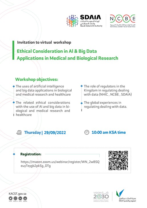 Invitation to the virtual workshop titled "Ethical Considerations in the Applications of Artificial Intelligence and Big Data in Biological and Medical Research"